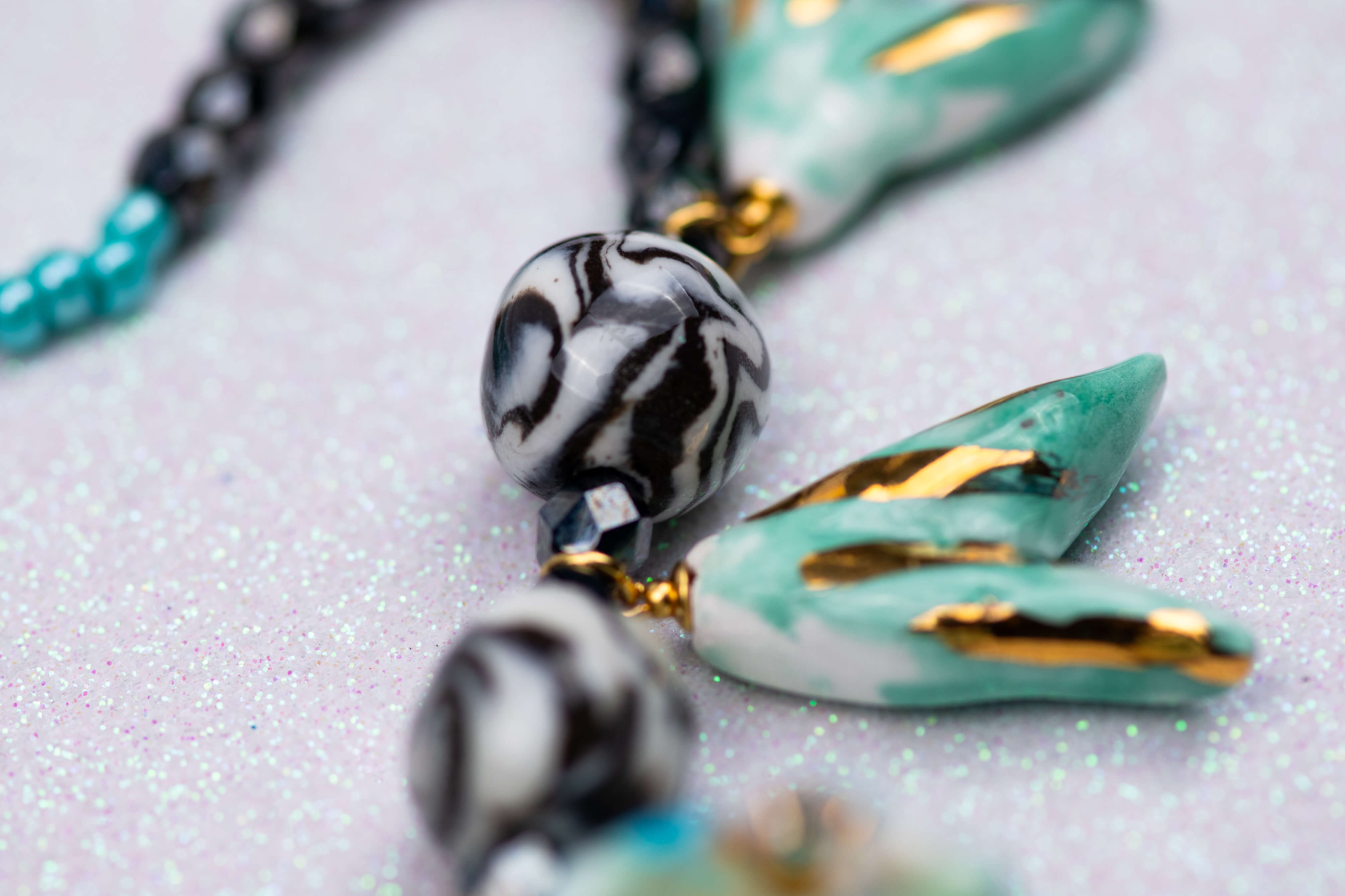 The delicate porcelain charms are paired with porcelain and glass beads, creating a design full of depth and elegance. A gold-plated silver clasp ensures both beauty and durability, while the entire piece is fully glazed for a smooth, polished feel from every angle.