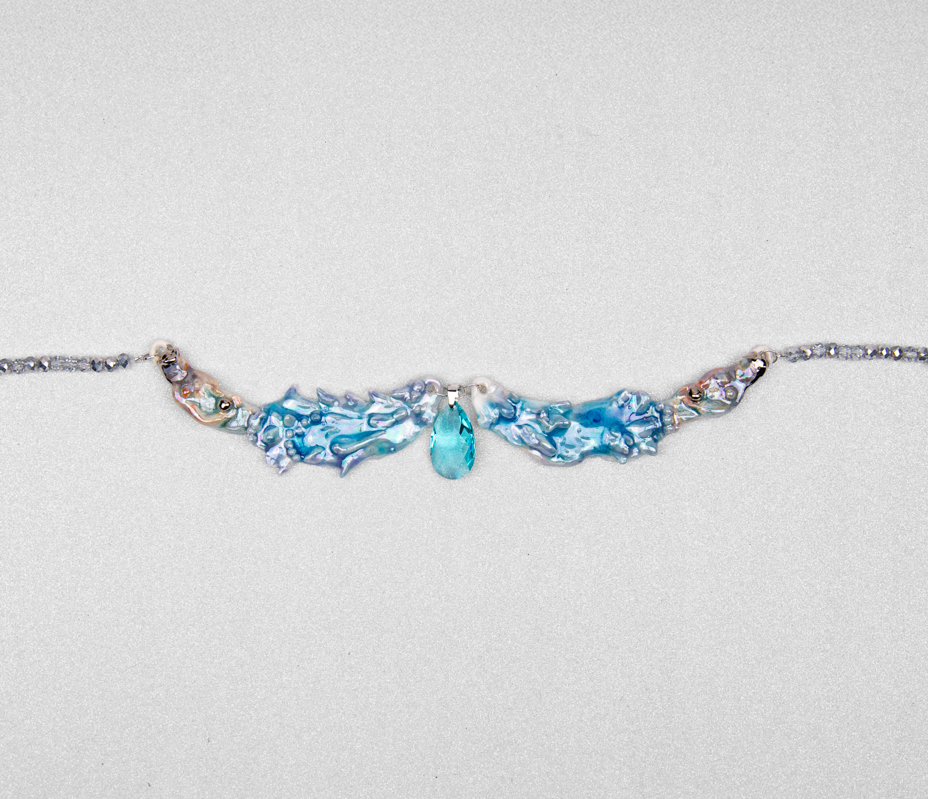 The mermaids are beautifully decorated with silver platina and mother-of-pearl luster, creating a subtle iridescent shimmer that enhances the delicate details. Accented with glass beads and sparkling Swarovski crystals, the necklace radiates sophistication and artistic charm.