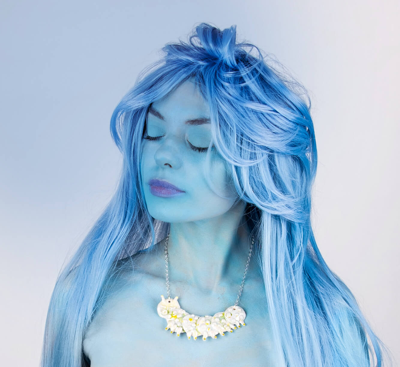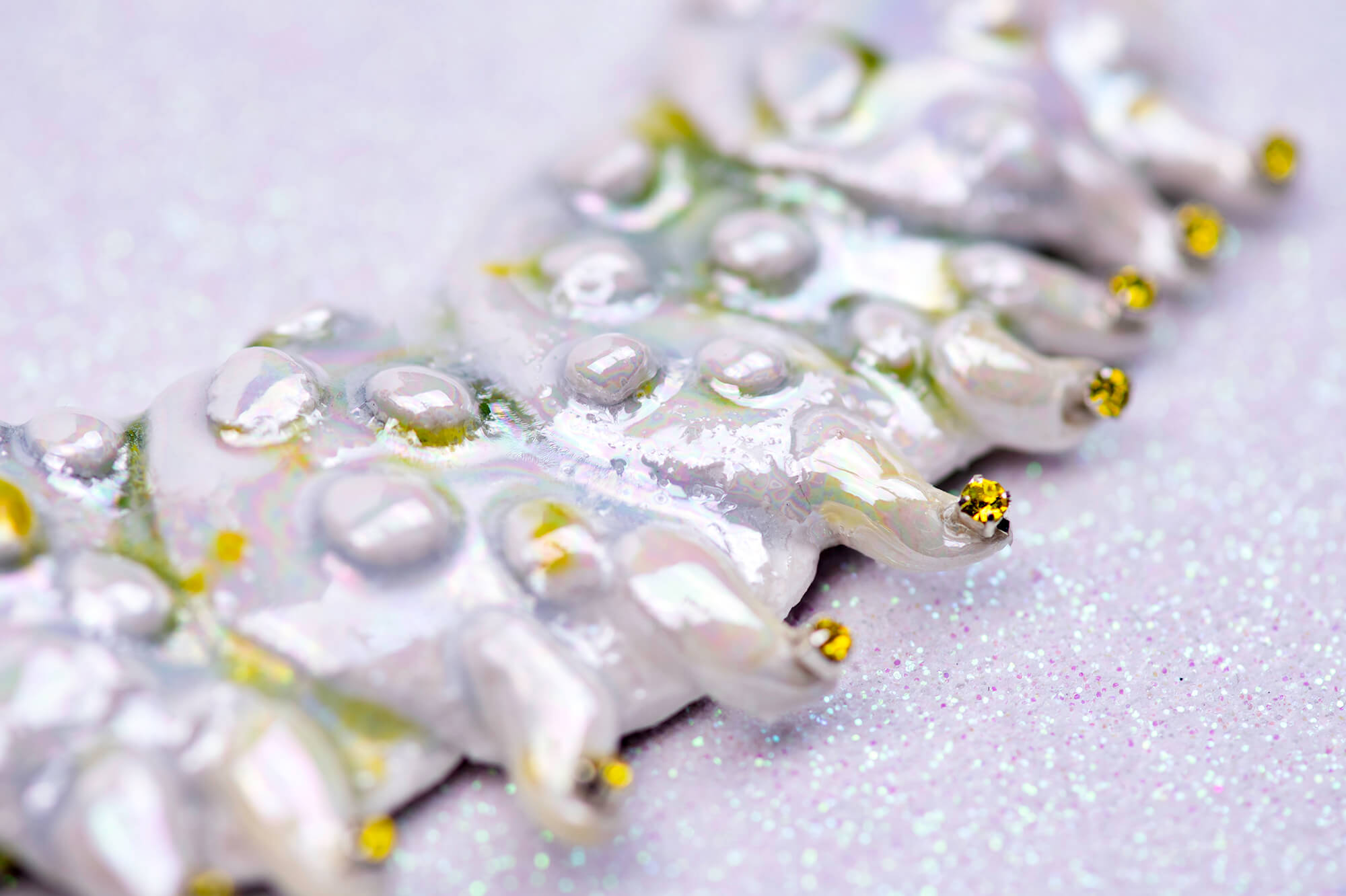 Discover the charm of this artistic white and yellow caterpillar choker, a unique porcelain necklace handcrafted with love in our studio. The delicate caterpillar pendant is adorned with tiny yellow zirconias and mother-of-pearl luster, giving it a soft, shimmering glow that adds a playful yet elegant touch.