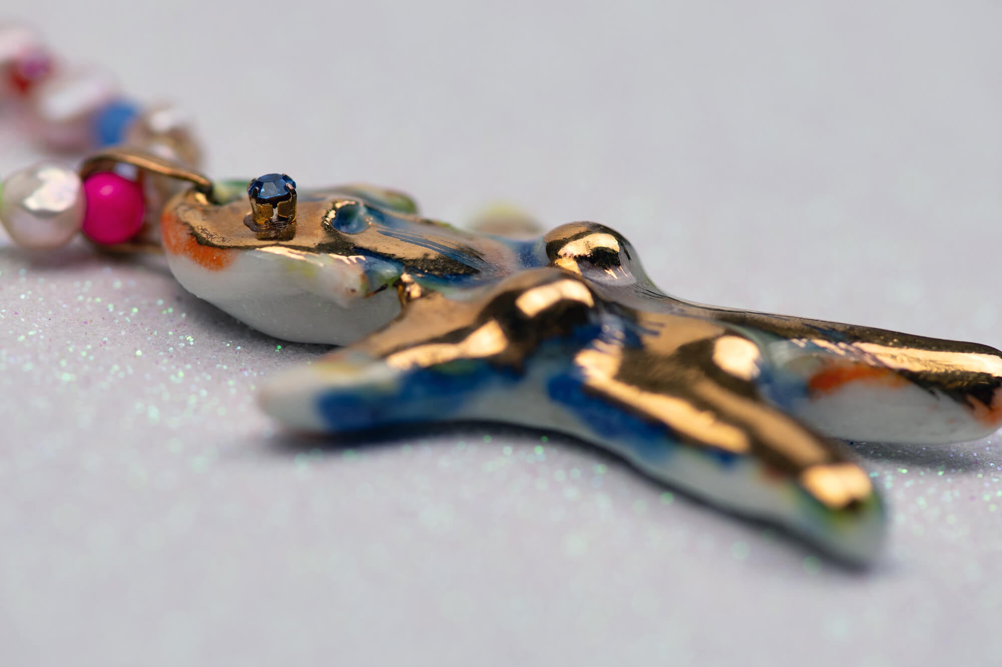 This gold girl angel necklace is a captivating, one-of-a-kind piece of art, handmade with love and care. The necklace features freshwater rose pearls and glass beads, creating a soft, elegant contrast with the porcelain pendant. The pendant is hand-painted and fired at 1250°C, then covered in real 24k gold luster for a luxurious finish.