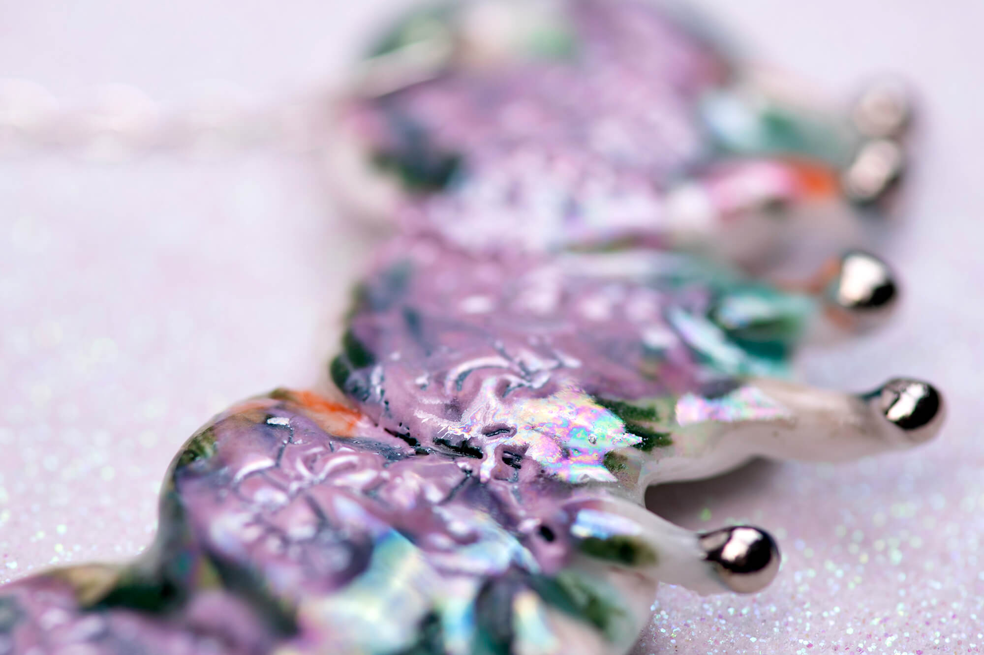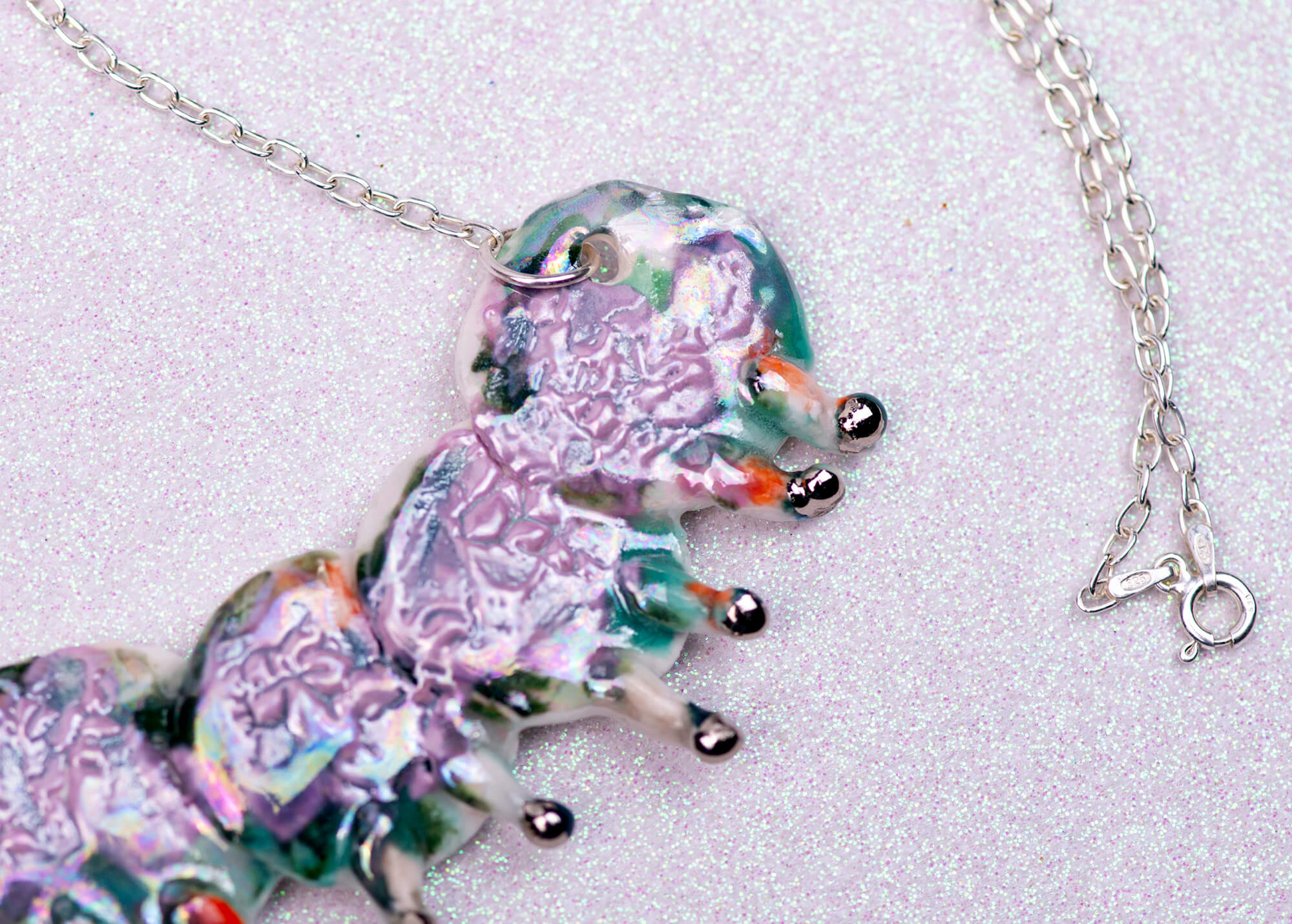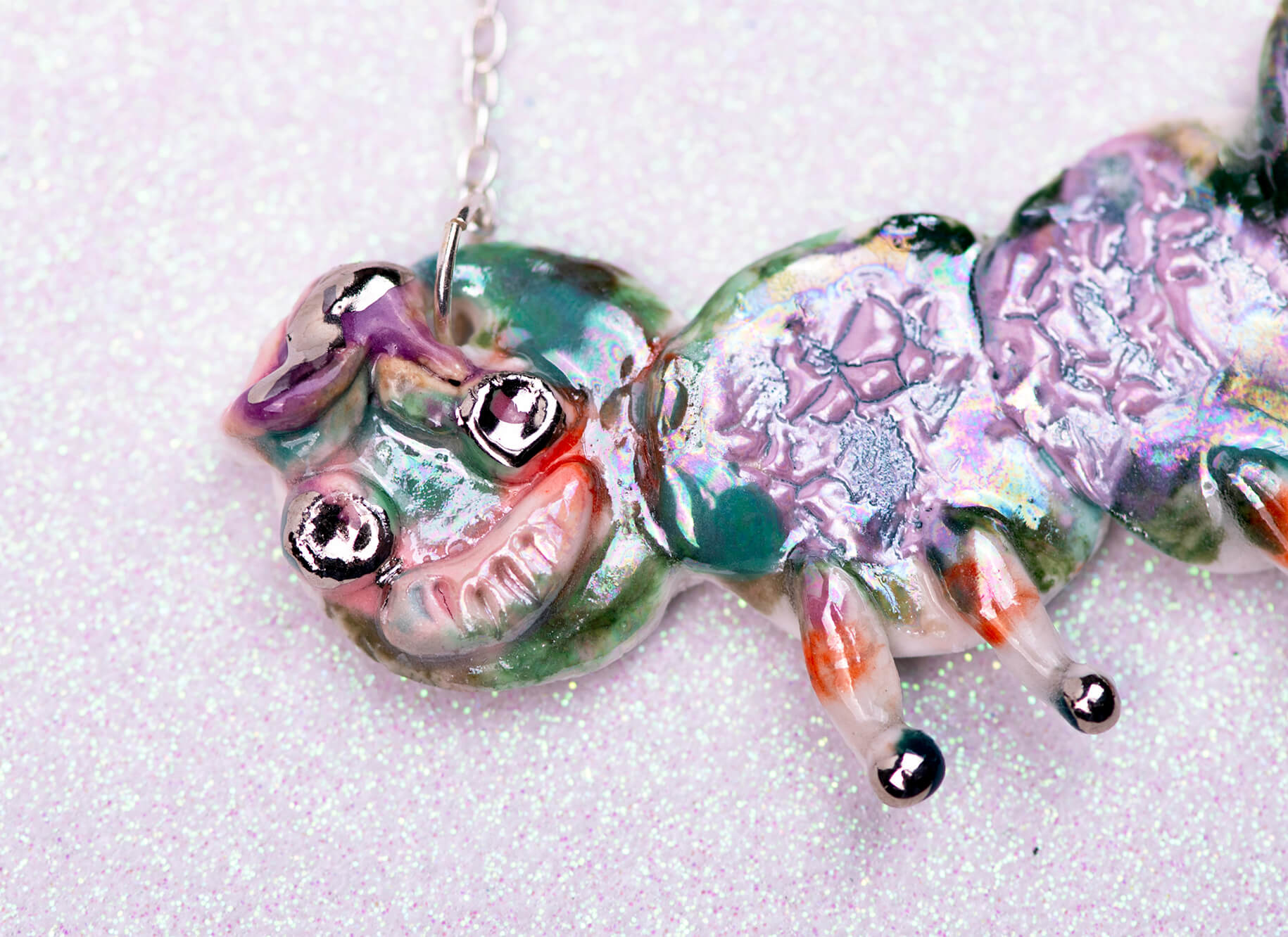 Discover a whimsical world with this handcrafted porcelain caterpillar necklace, a playful and enchanting piece created with love in my ceramic studio. The violet-green caterpillar pendant glimmers with a delicate mother-of-pearl and silver luster, offering a soft, iridescent glow that catches the light beautifully.