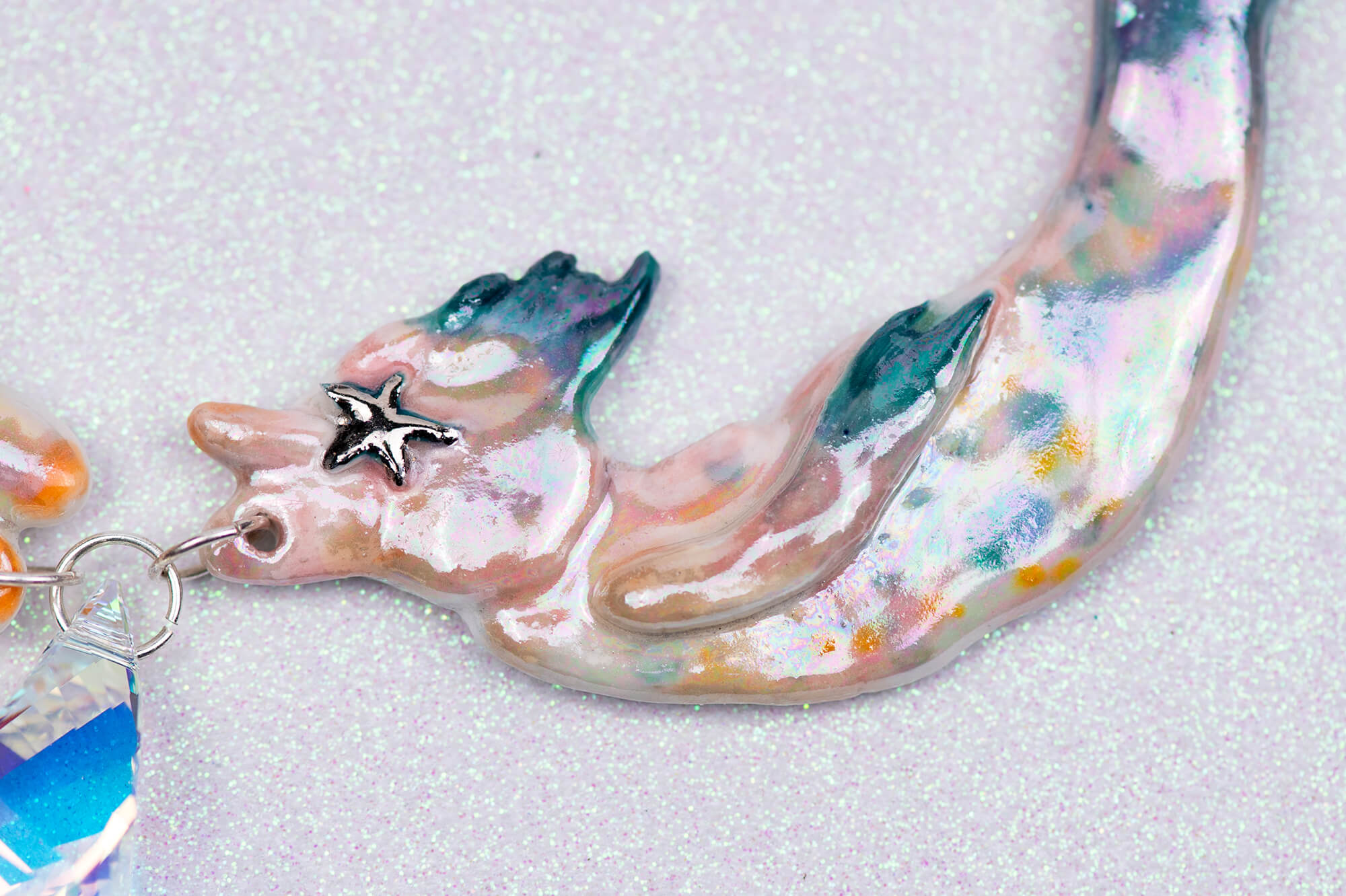 Celebrate the magic of the ocean with this handmade porcelain necklace, featuring a captivating love scene between a mermaid and a sea serpent. This extraordinary pendant design highlights a shimmering drop of water, the serpent’s striking eye, and Swarovski crystal accents that bring sparkle and elegance to the piece.